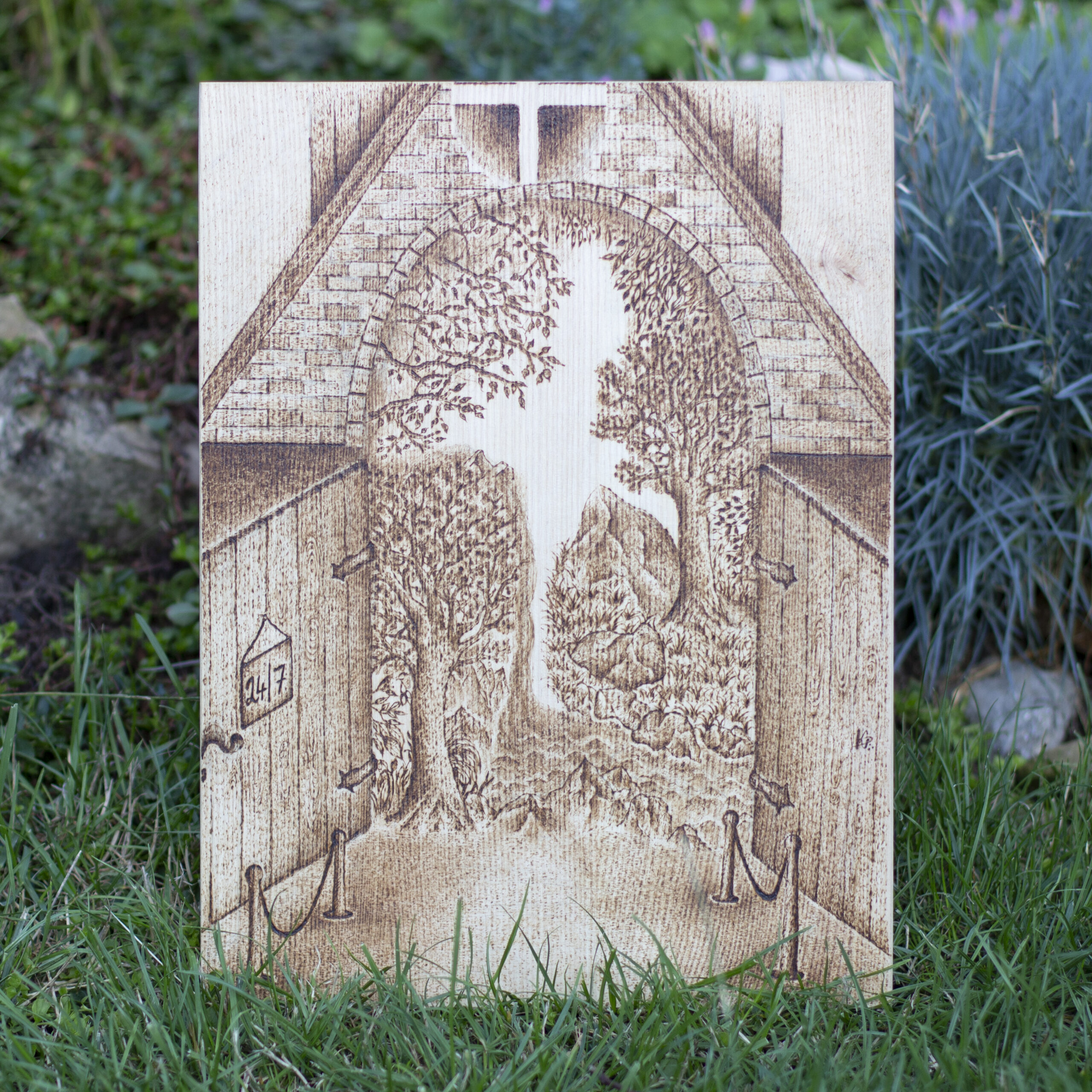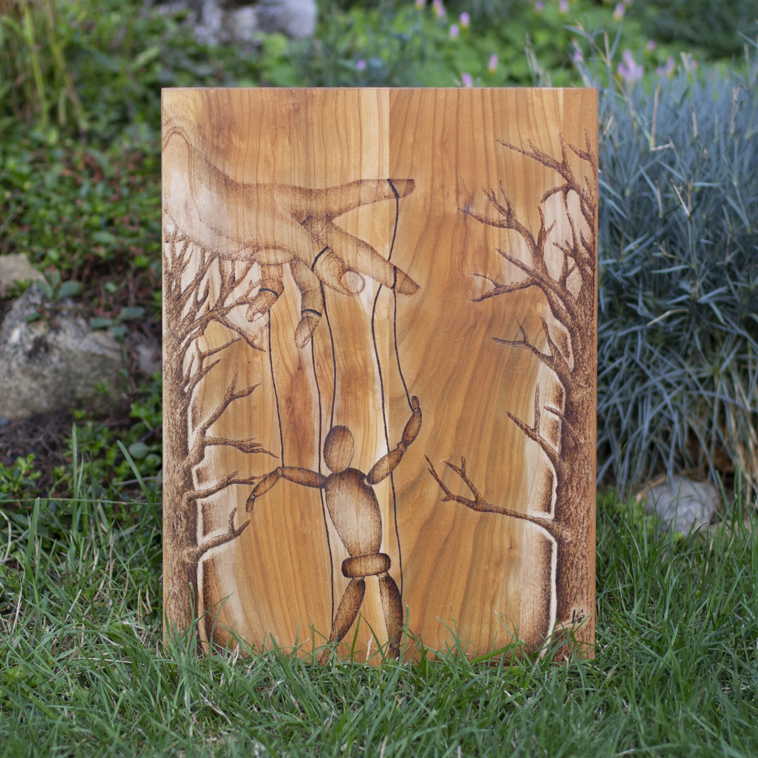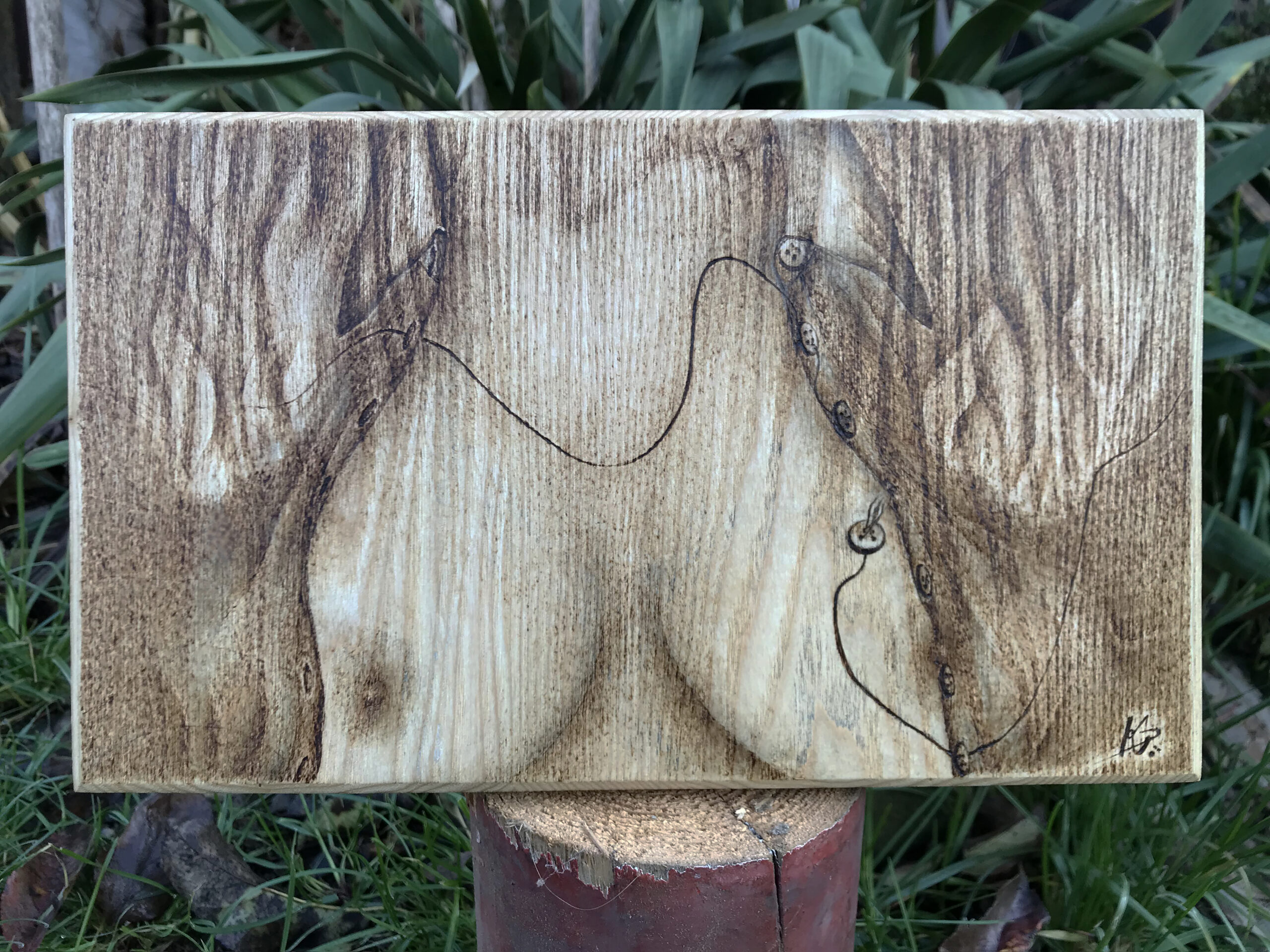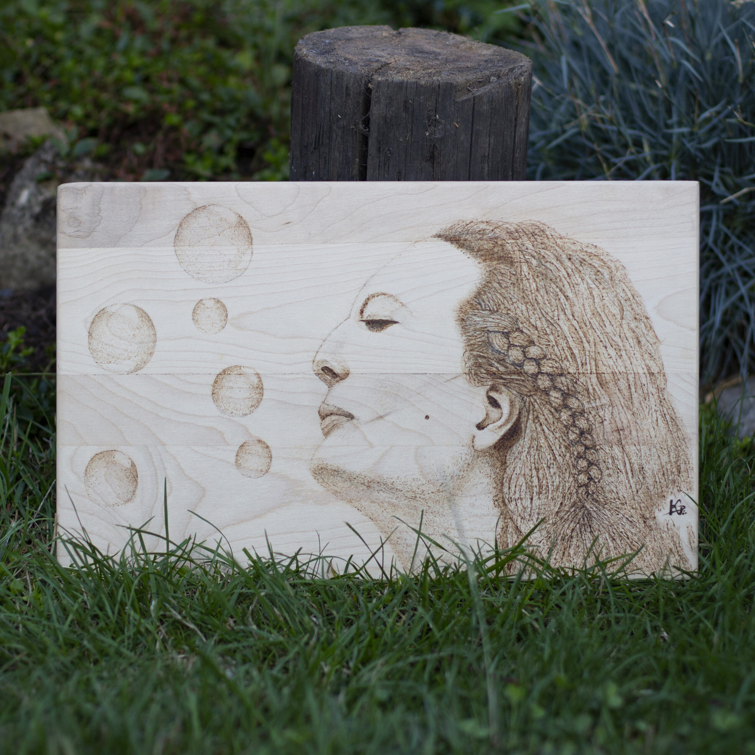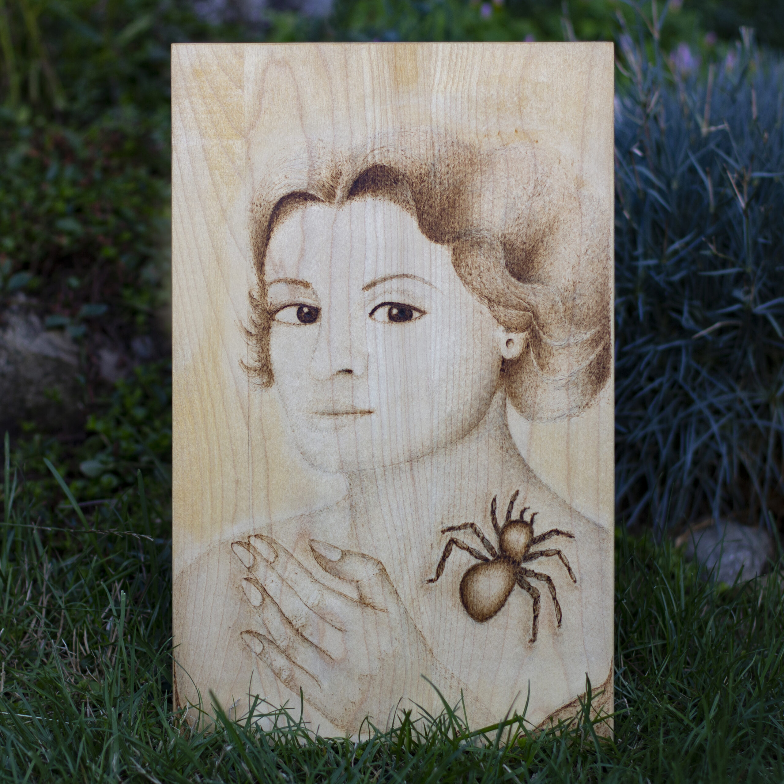 Pyrografie je originální a docela zdlouhavá technika, kdy se ručně s pomocí horkého předmětu (v mém případě pera se žhavým drátem) vypalují/kreslí monochromatické obrazy do dřeva.