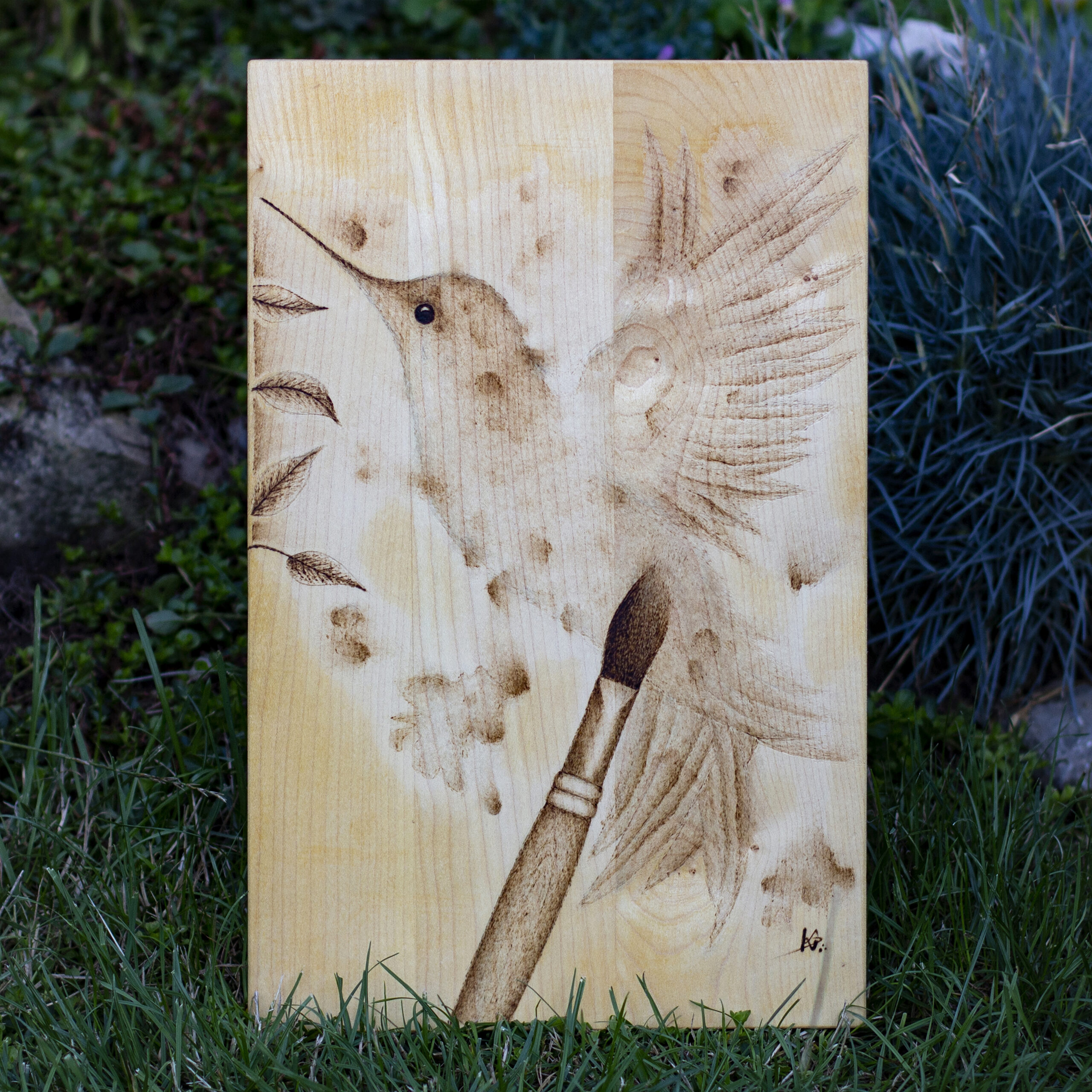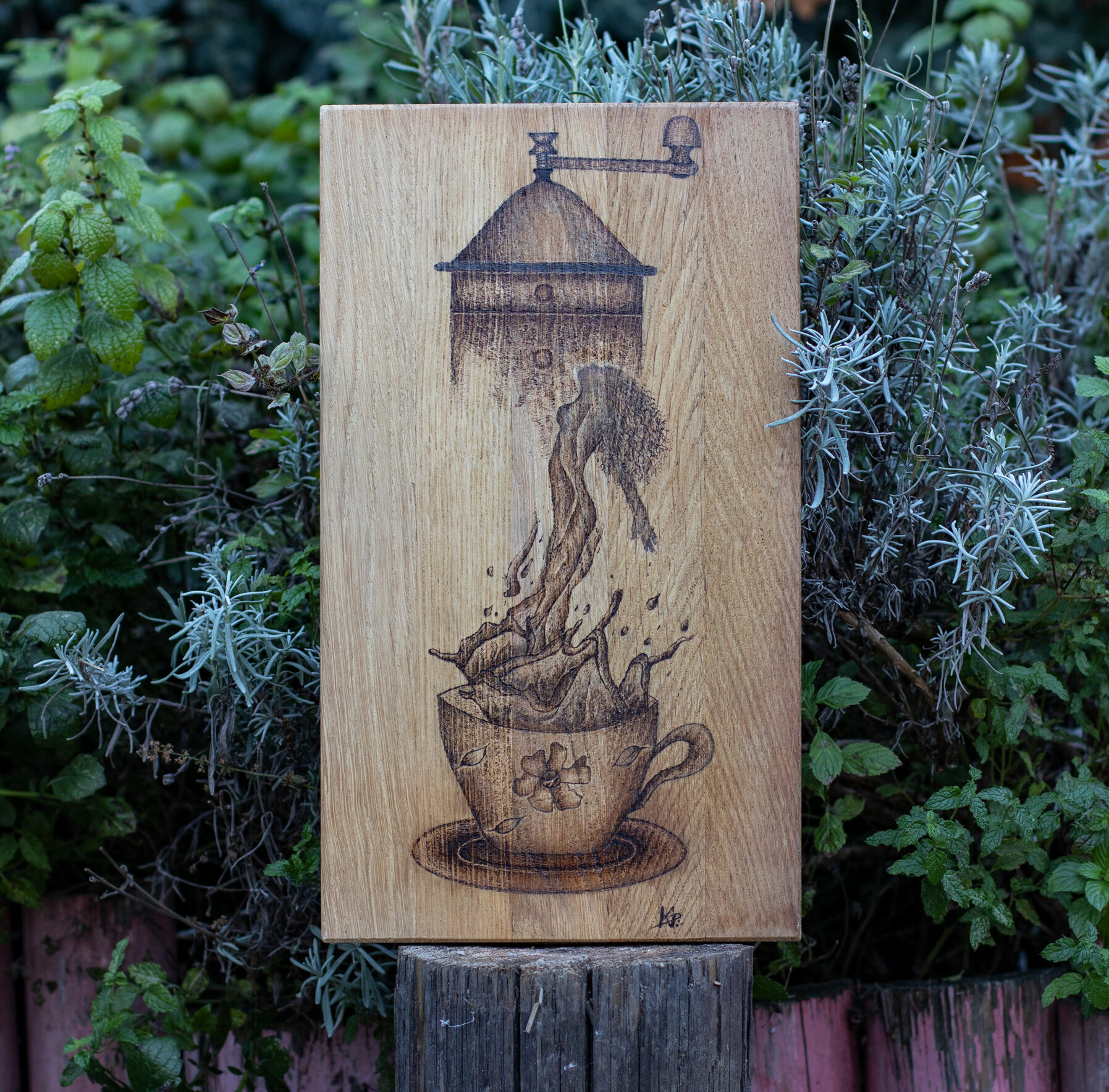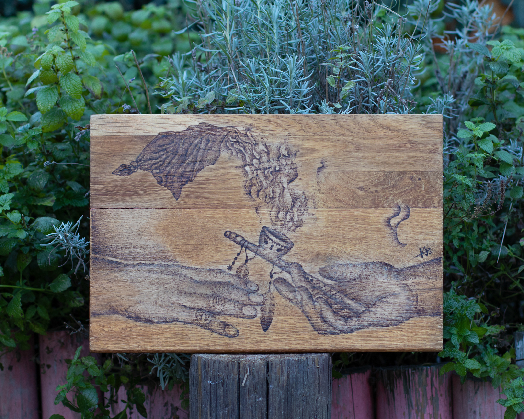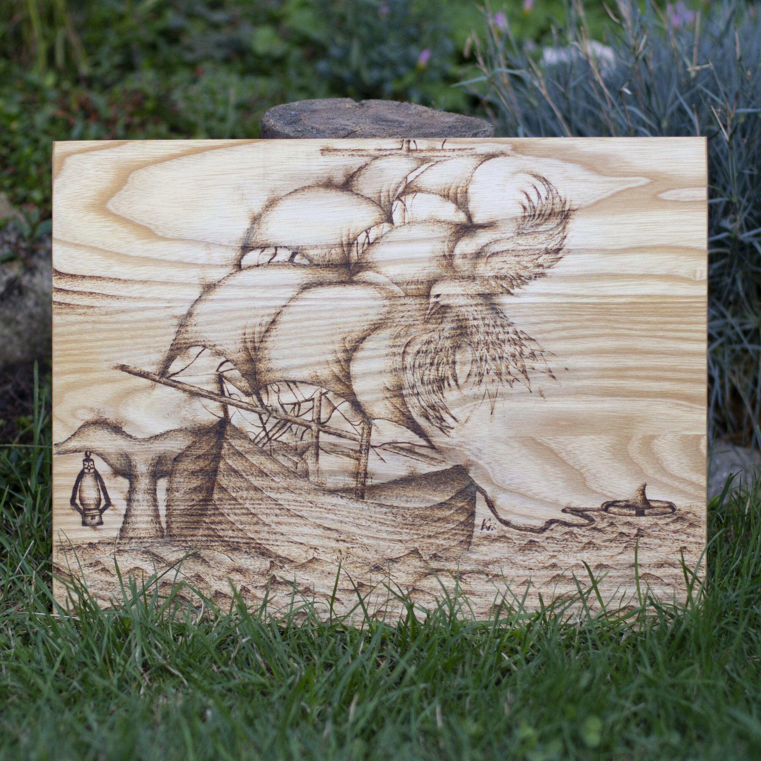Pyrografie je originální a docela zdlouhavá technika, kdy se ručně s pomocí horkého předmětu (v mém případě pera se žhavým drátem) vypalují/kreslí monochromatické obrazy do dřeva.