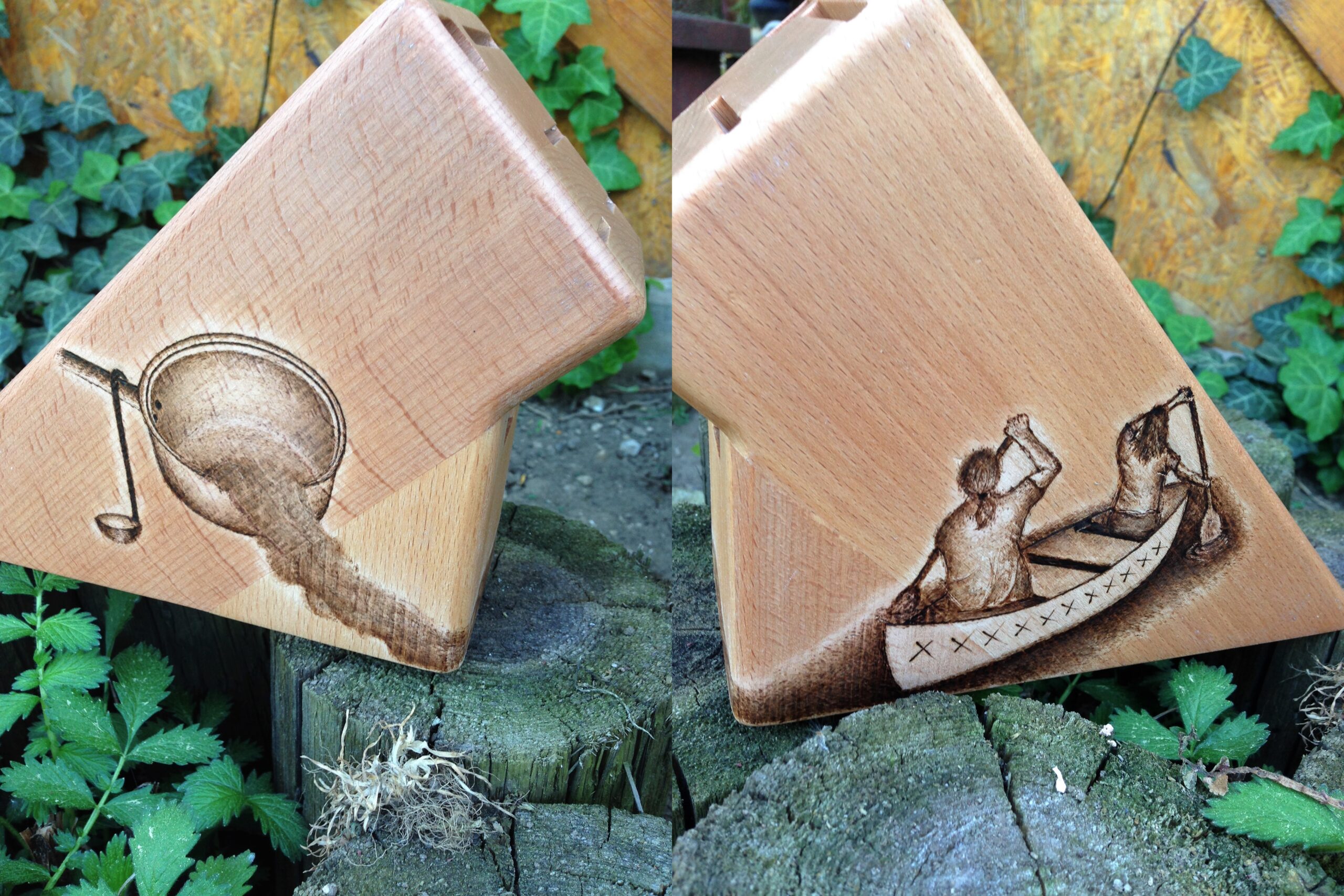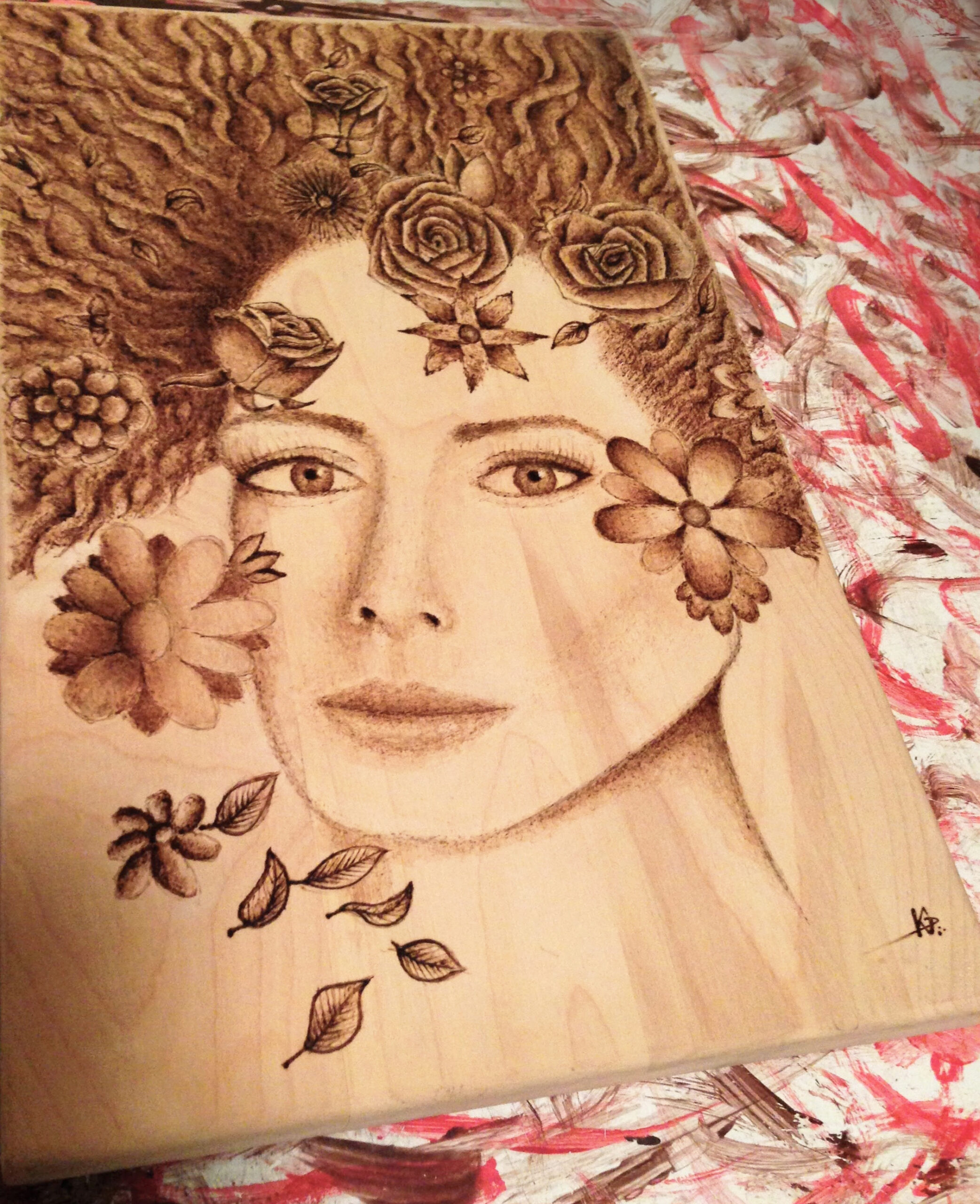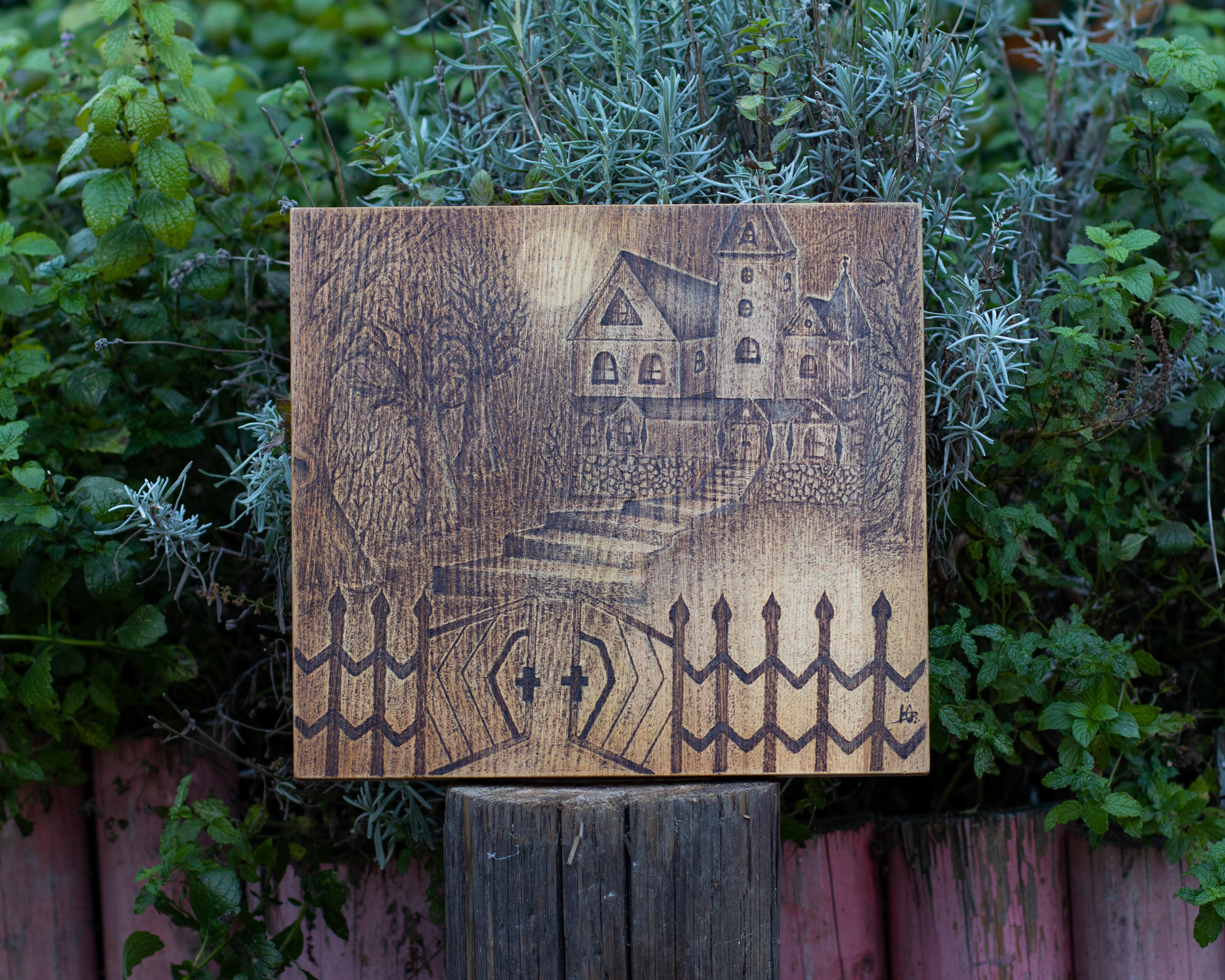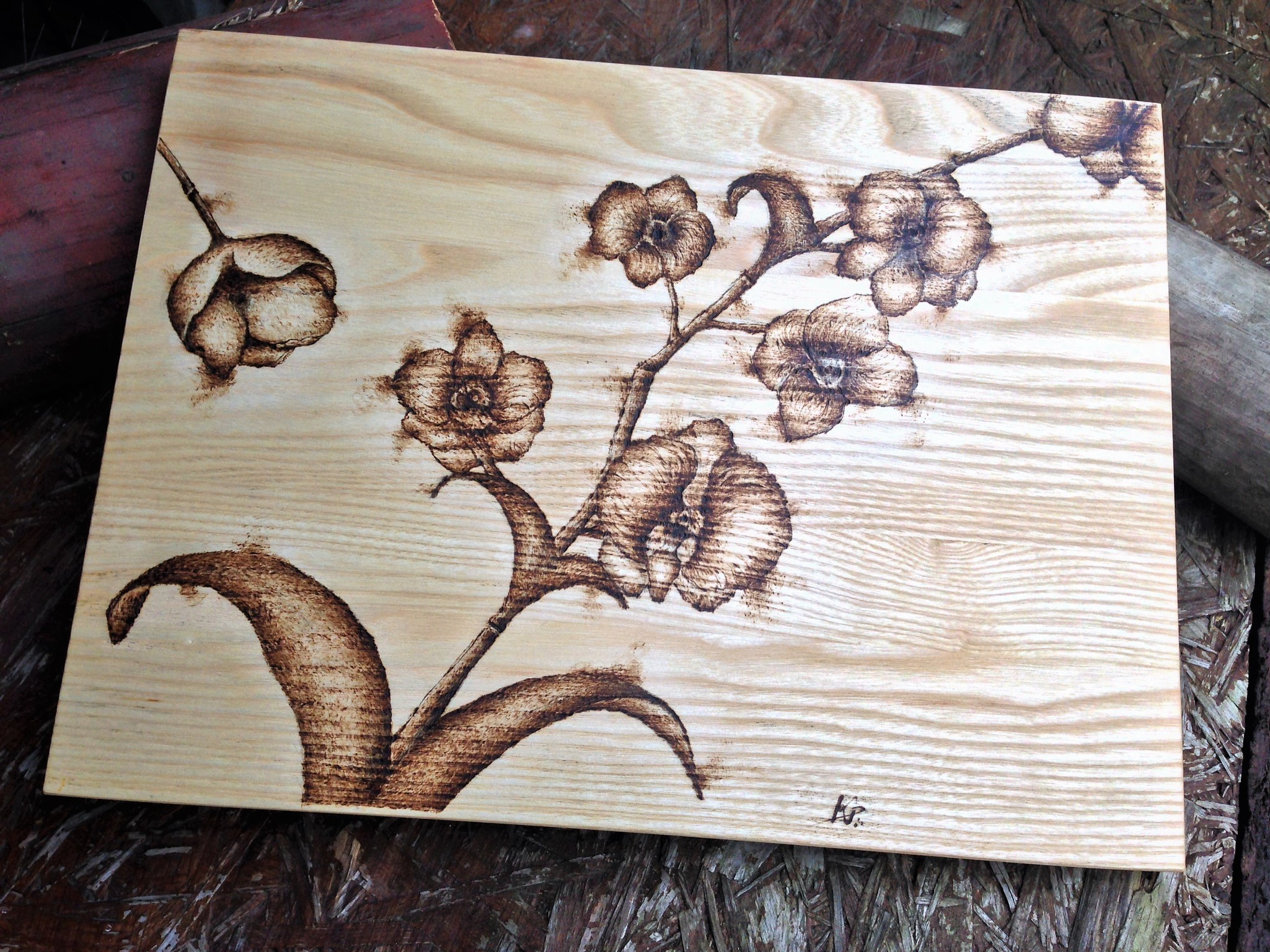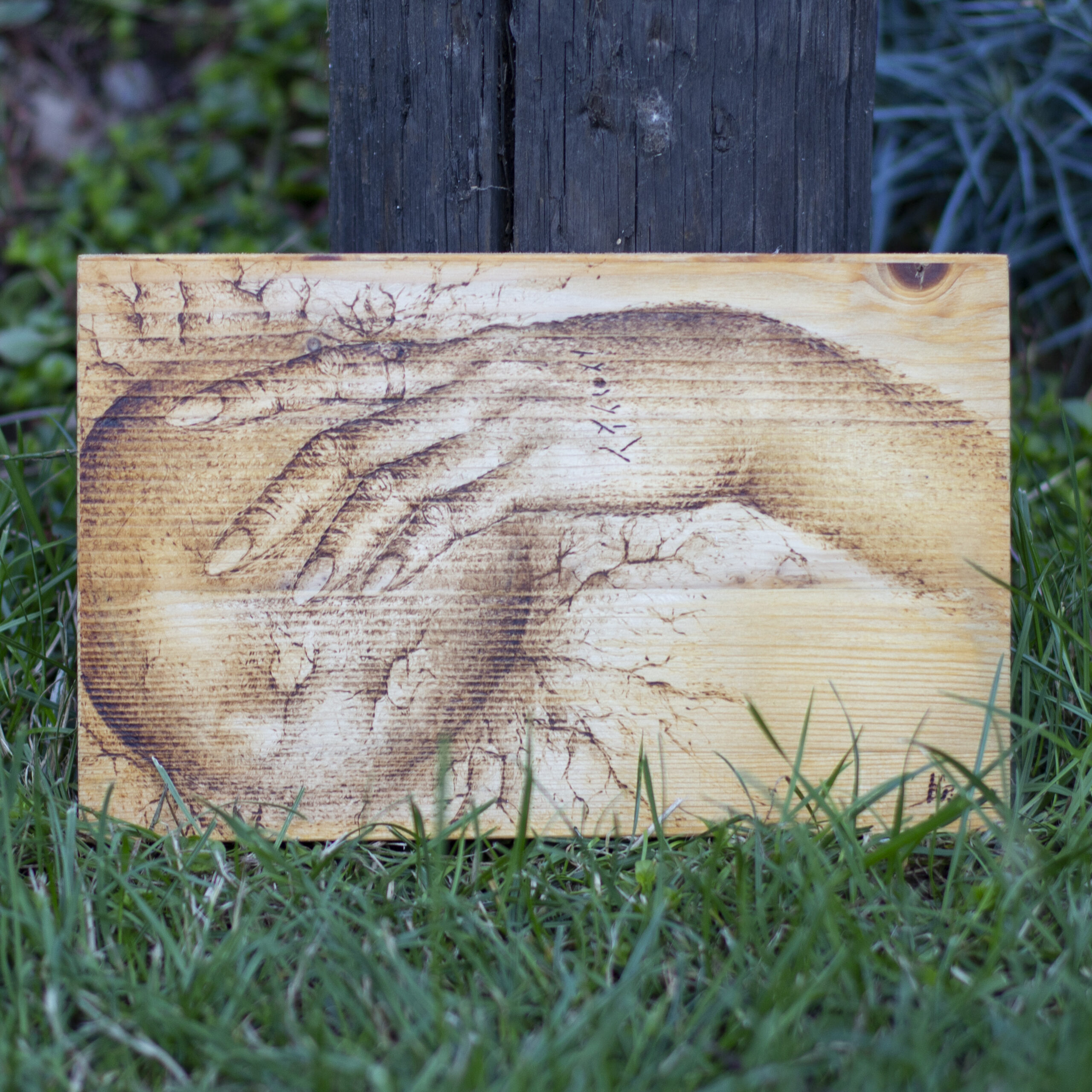 Pyrografie je originální a docela zdlouhavá technika, kdy se ručně s pomocí horkého předmětu (v mém případě pera se žhavým drátem) vypalují/kreslí monochromatické obrazy do dřeva.