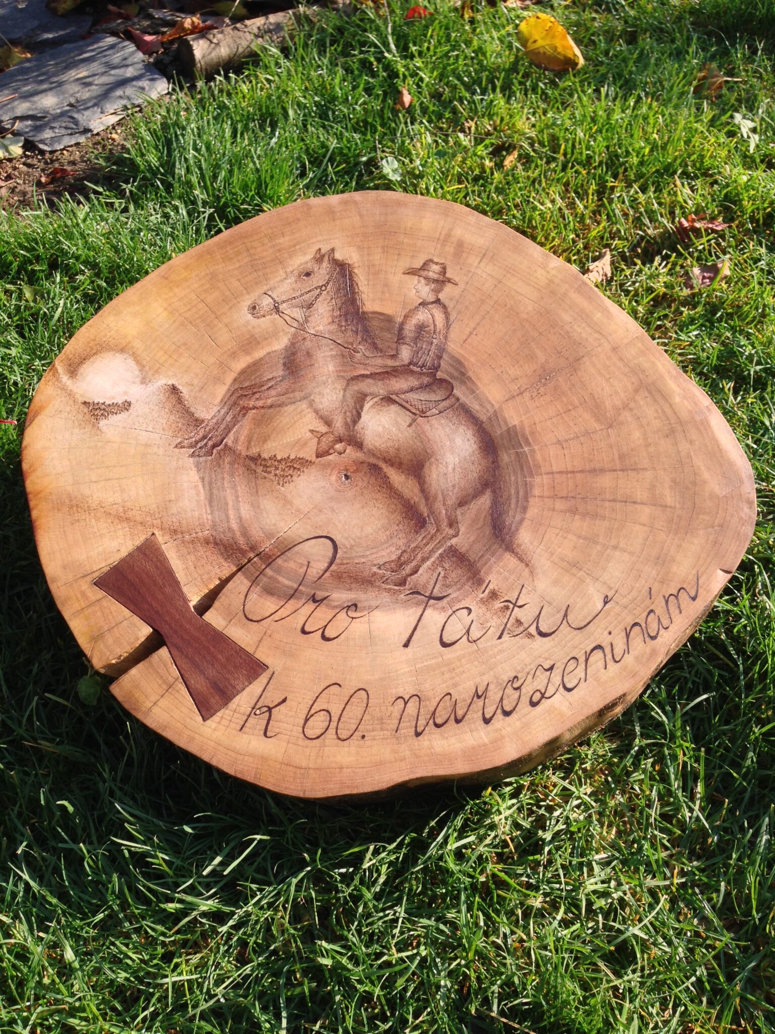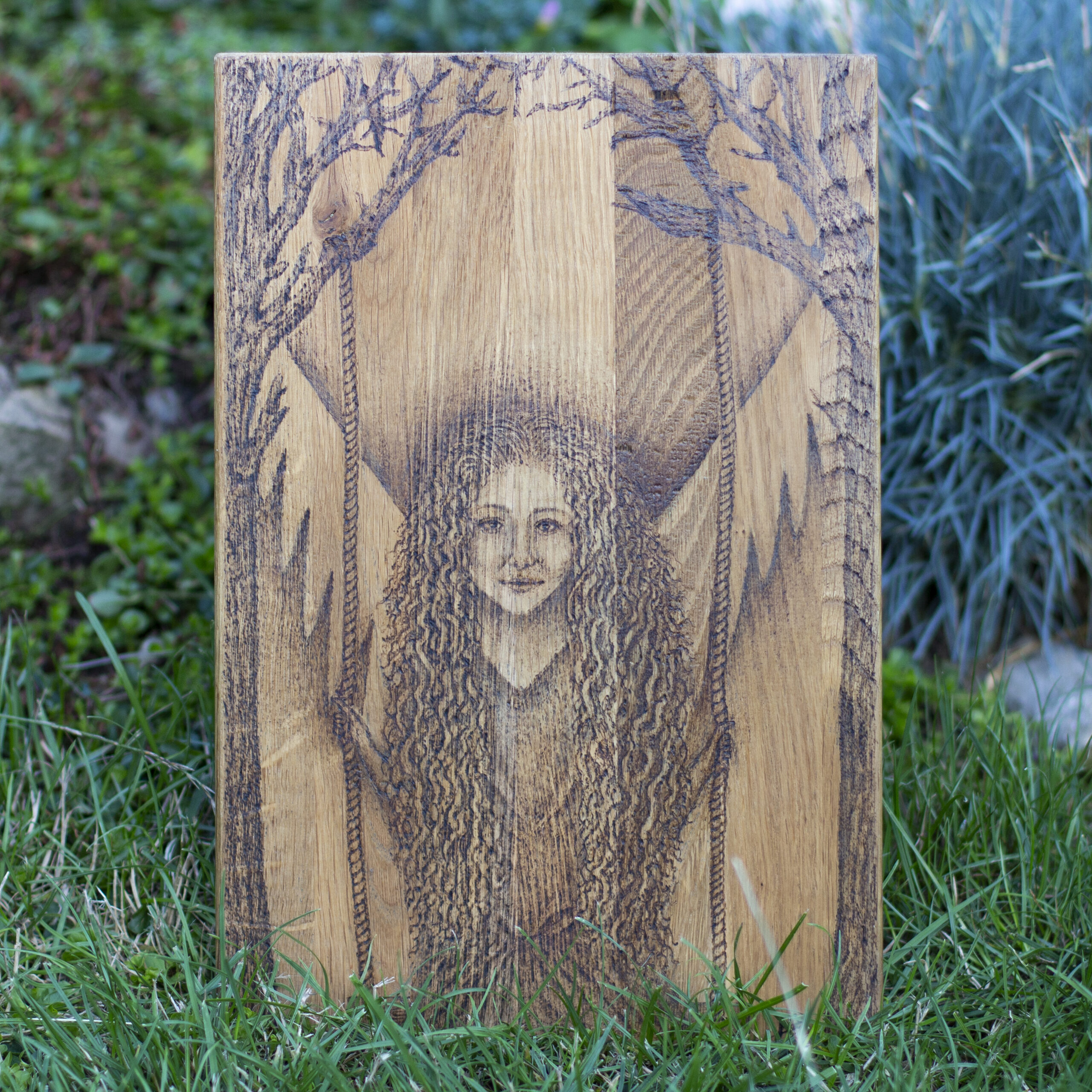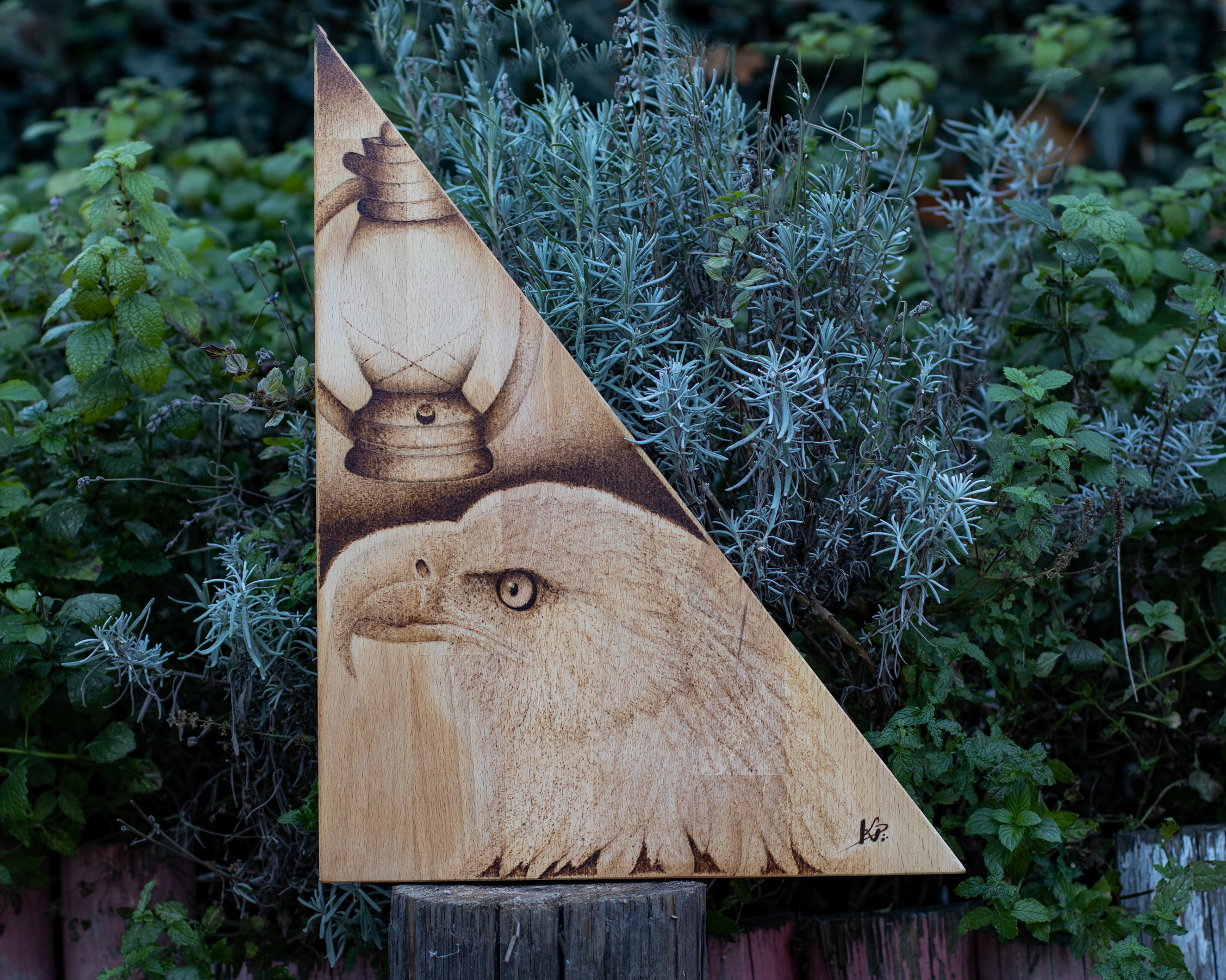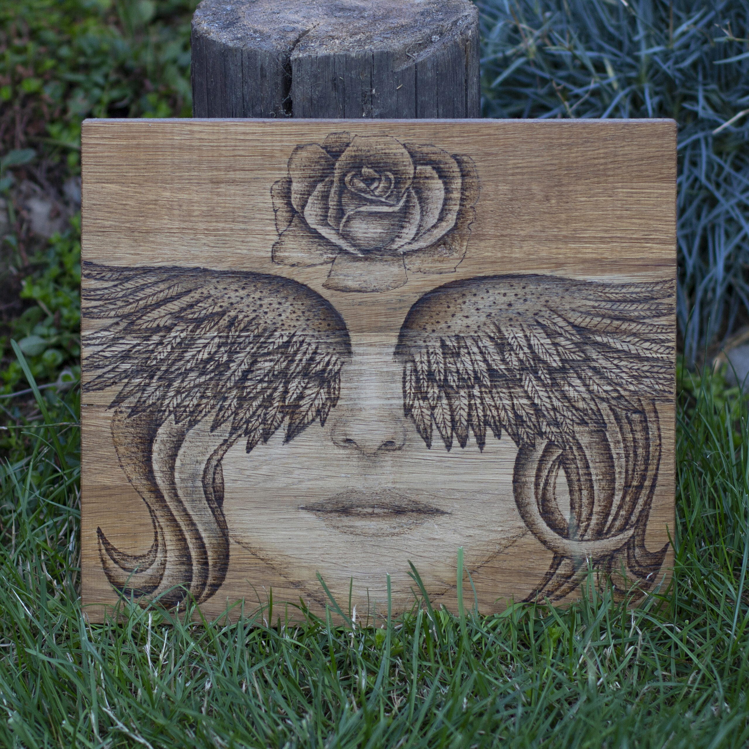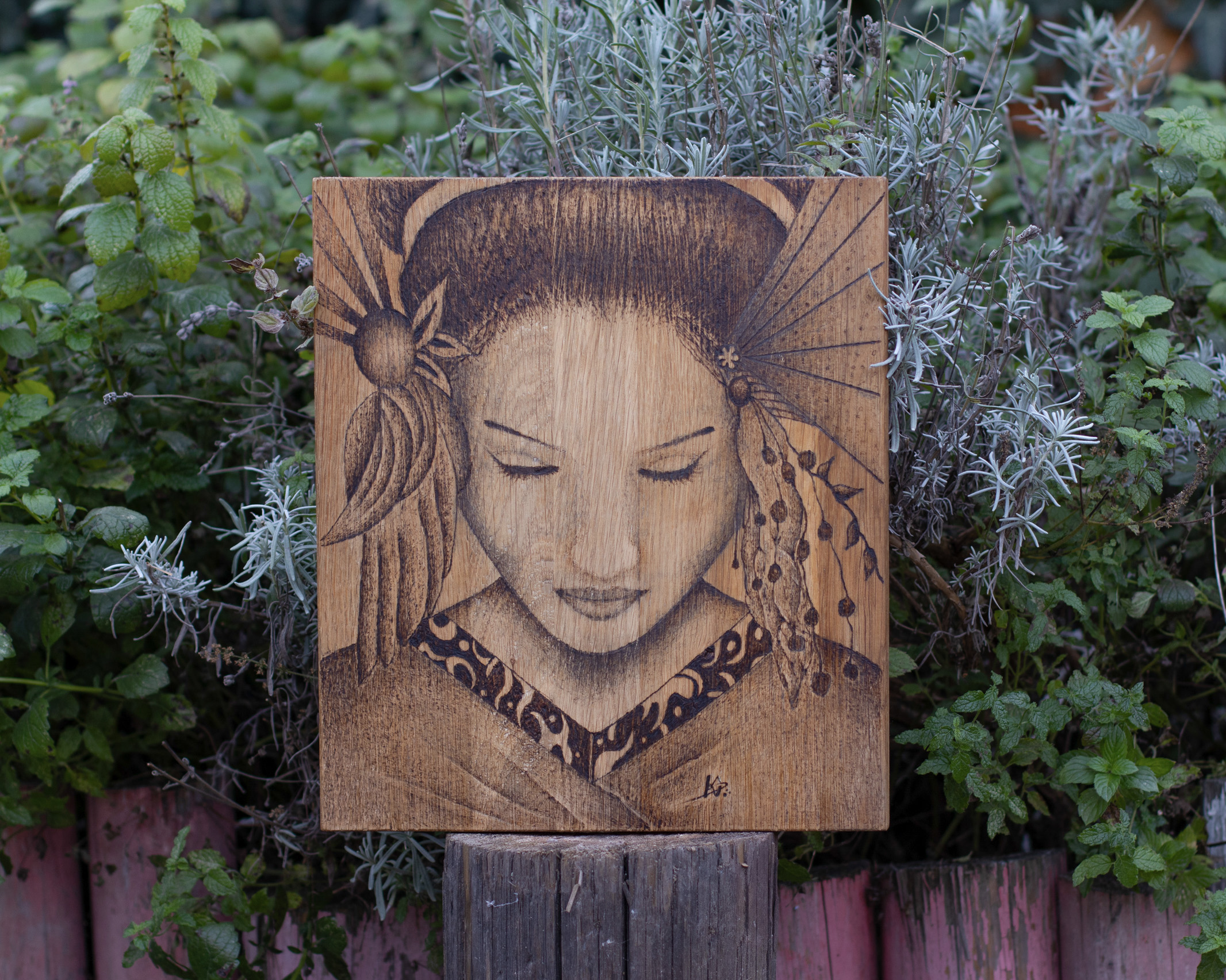Pyrografie je originální a docela zdlouhavá technika, kdy se ručně s pomocí horkého předmětu (v mém případě pera se žhavým drátem) vypalují/kreslí monochromatické obrazy do dřeva.