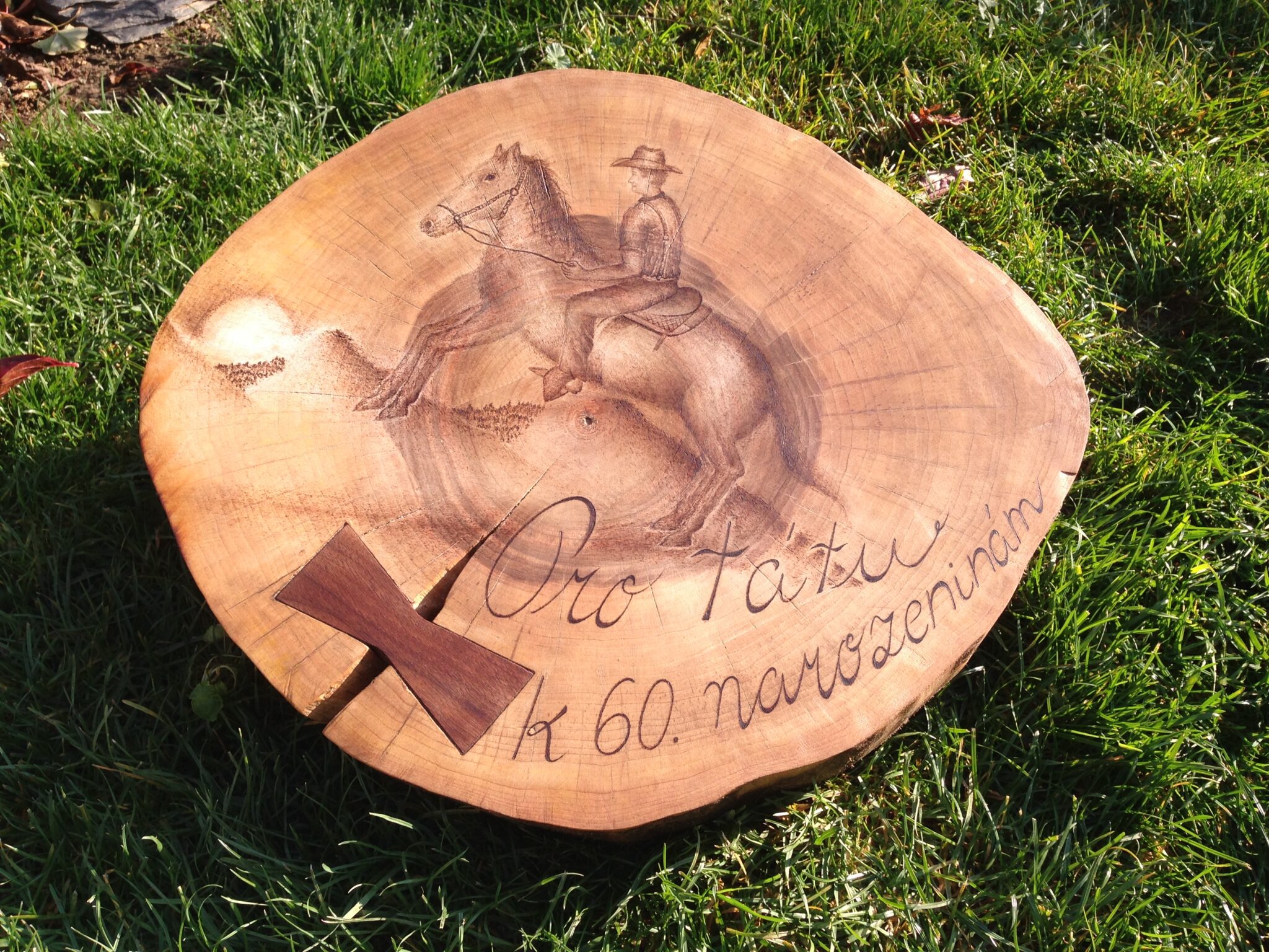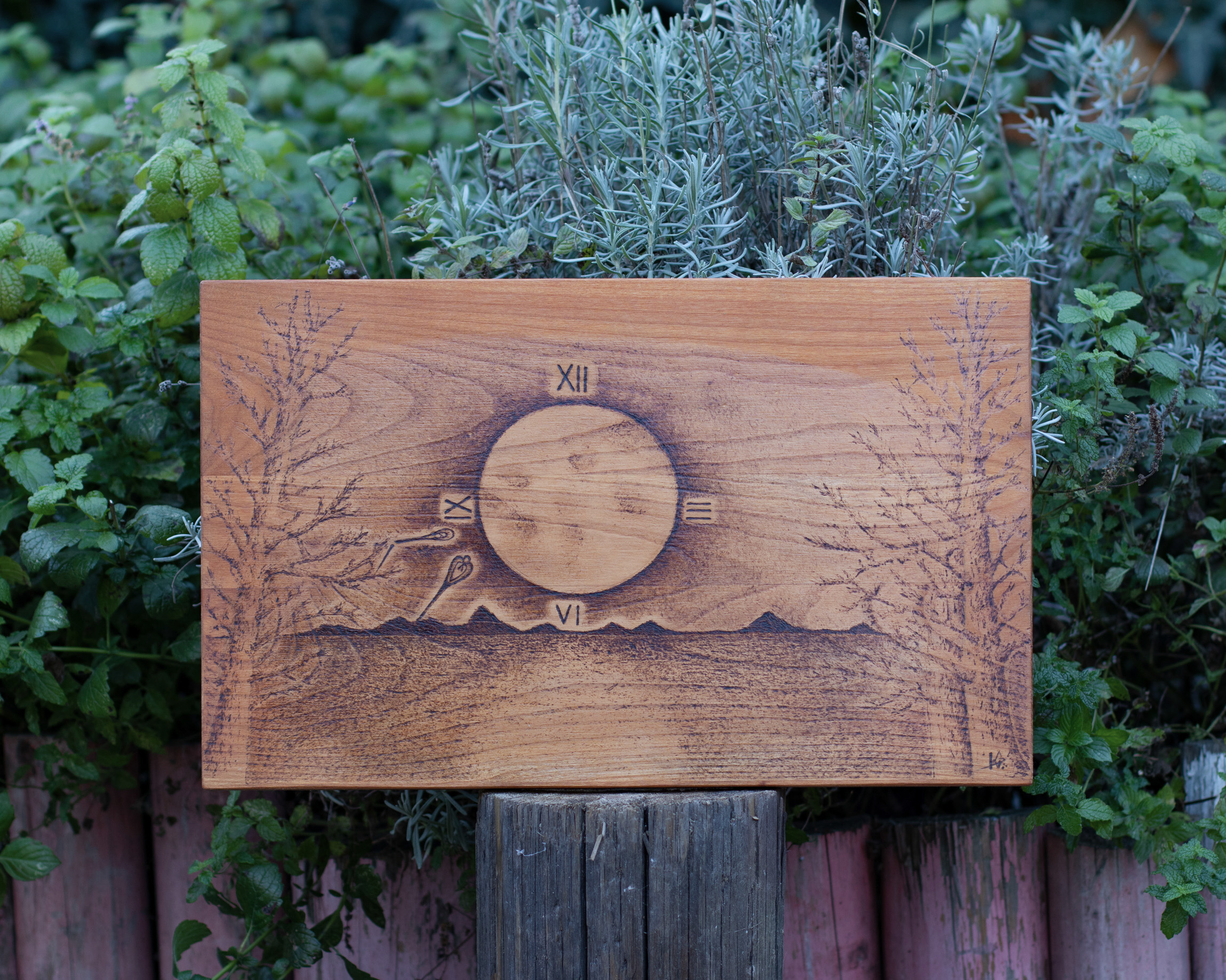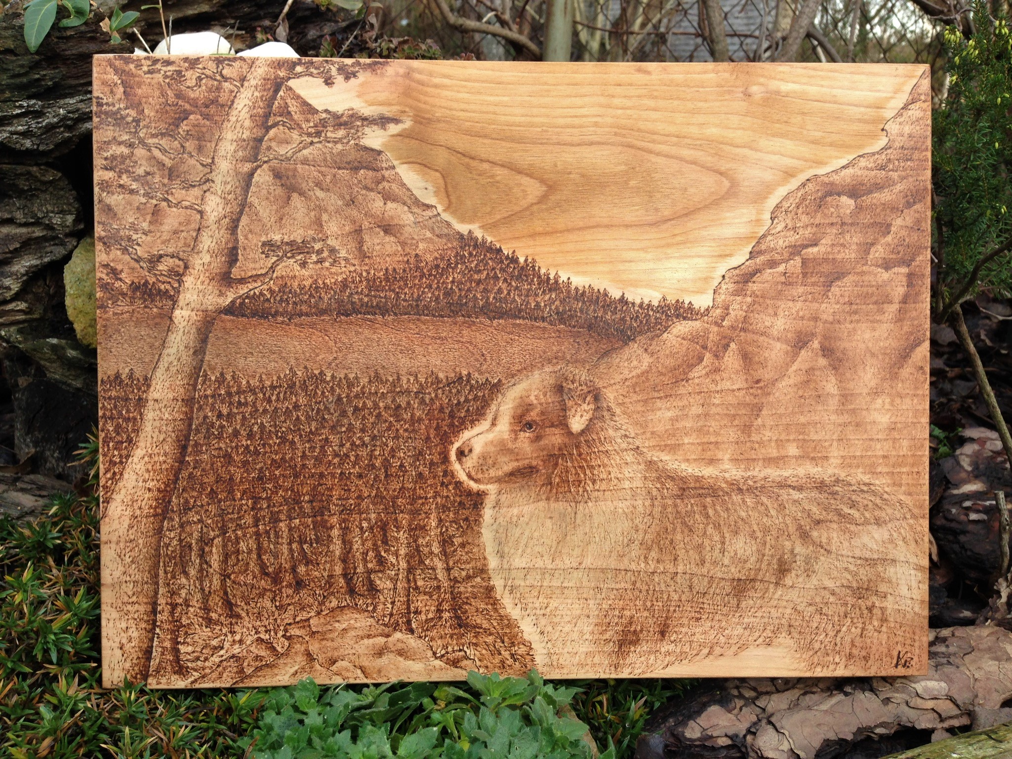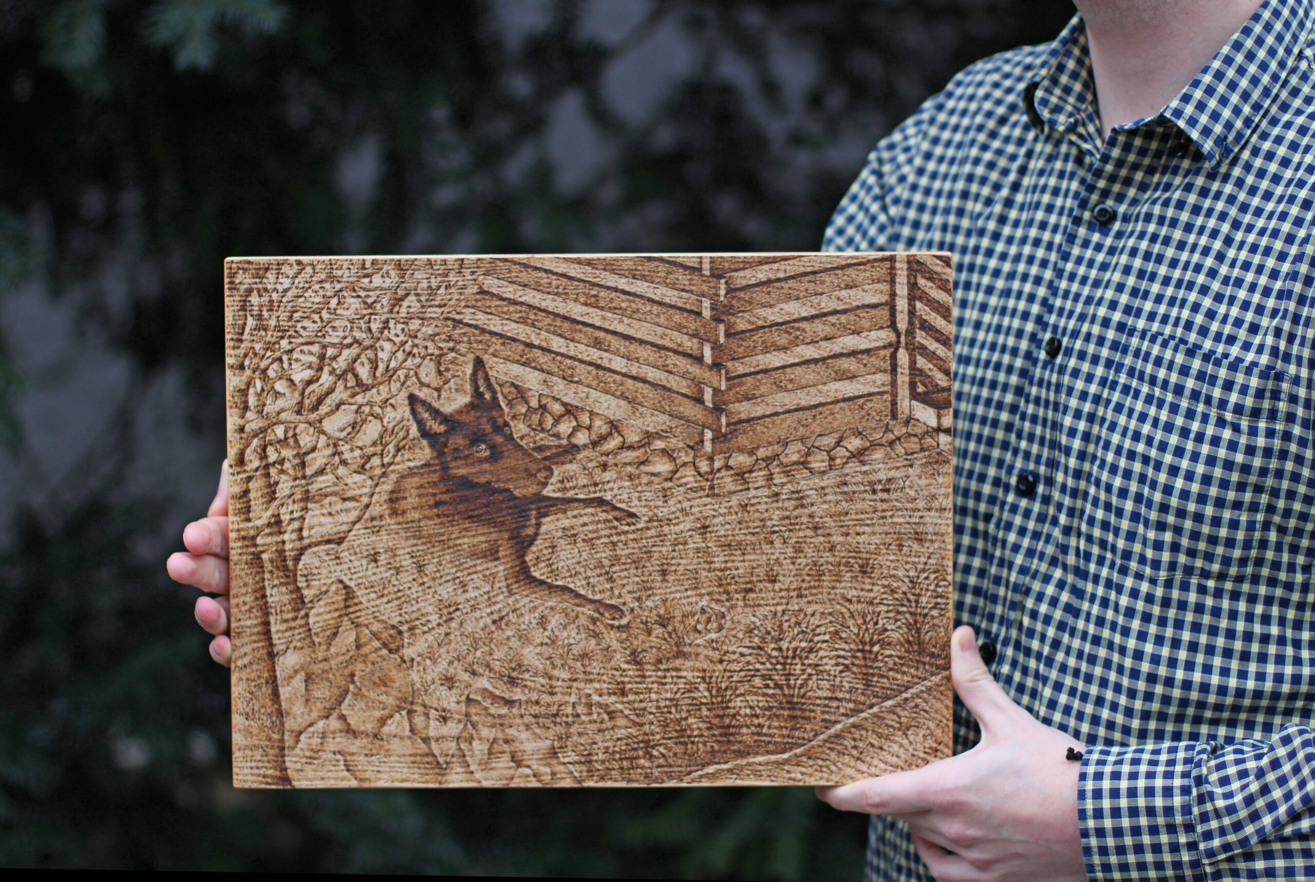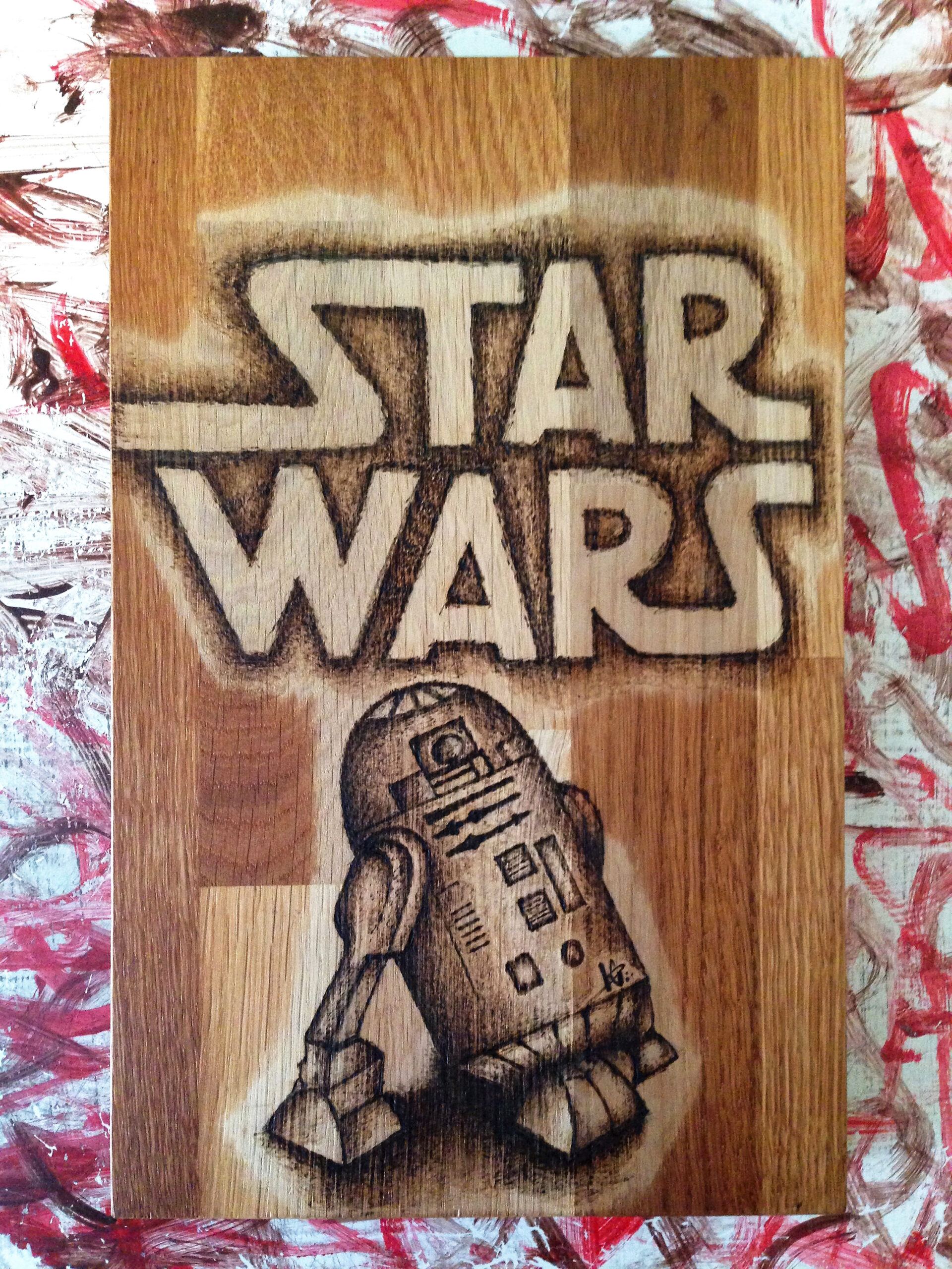 Pyrografie je originální a docela zdlouhavá technika, kdy se ručně s pomocí horkého předmětu (v mém případě pera se žhavým drátem) vypalují/kreslí monochromatické obrazy do dřeva.