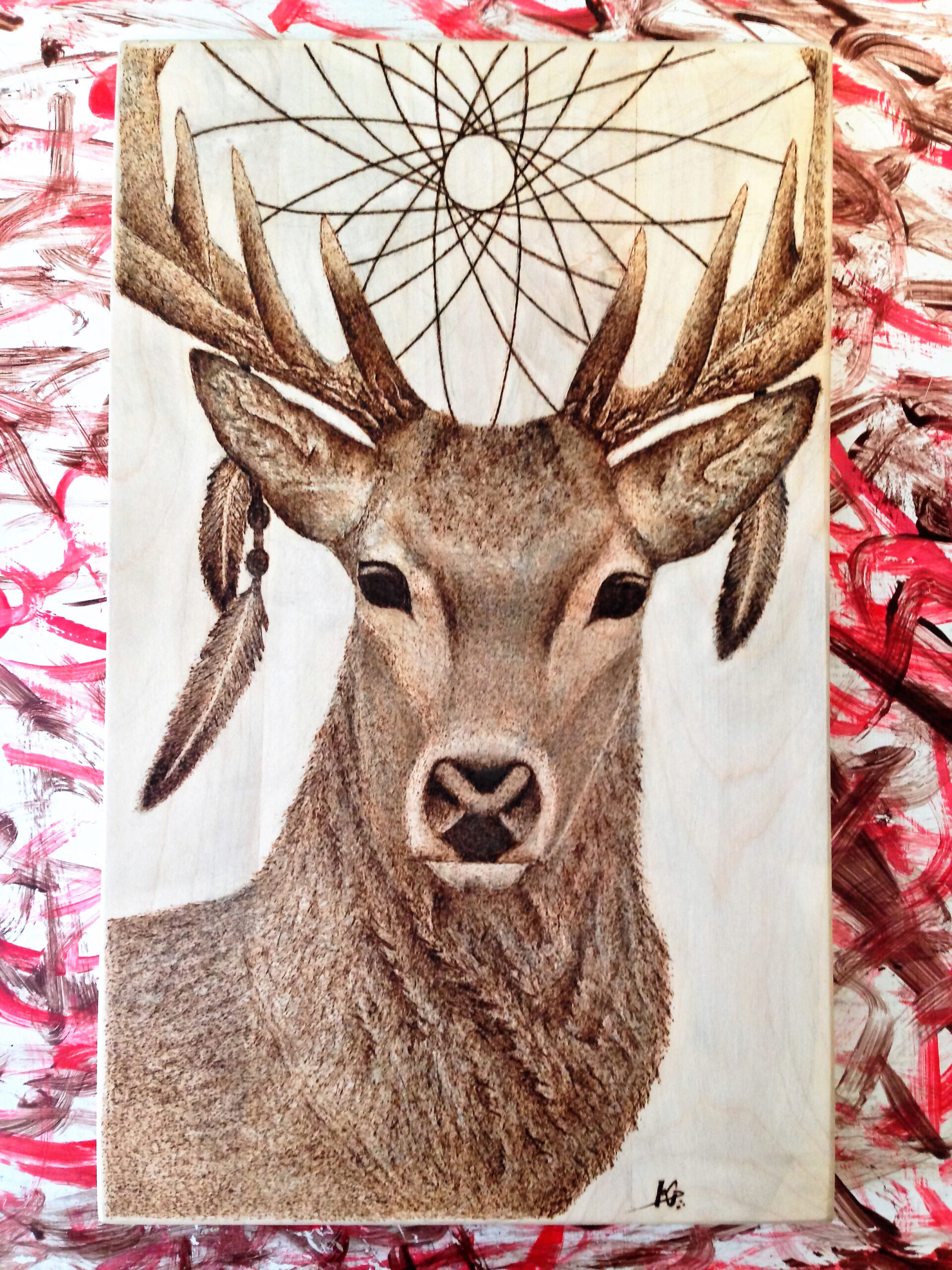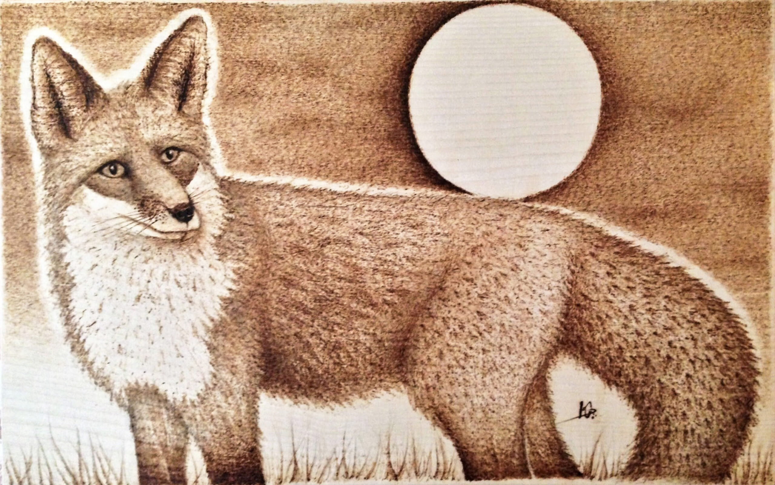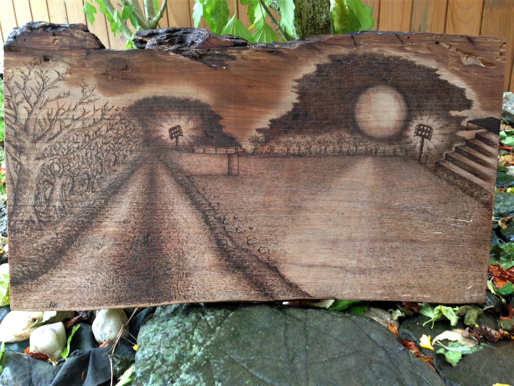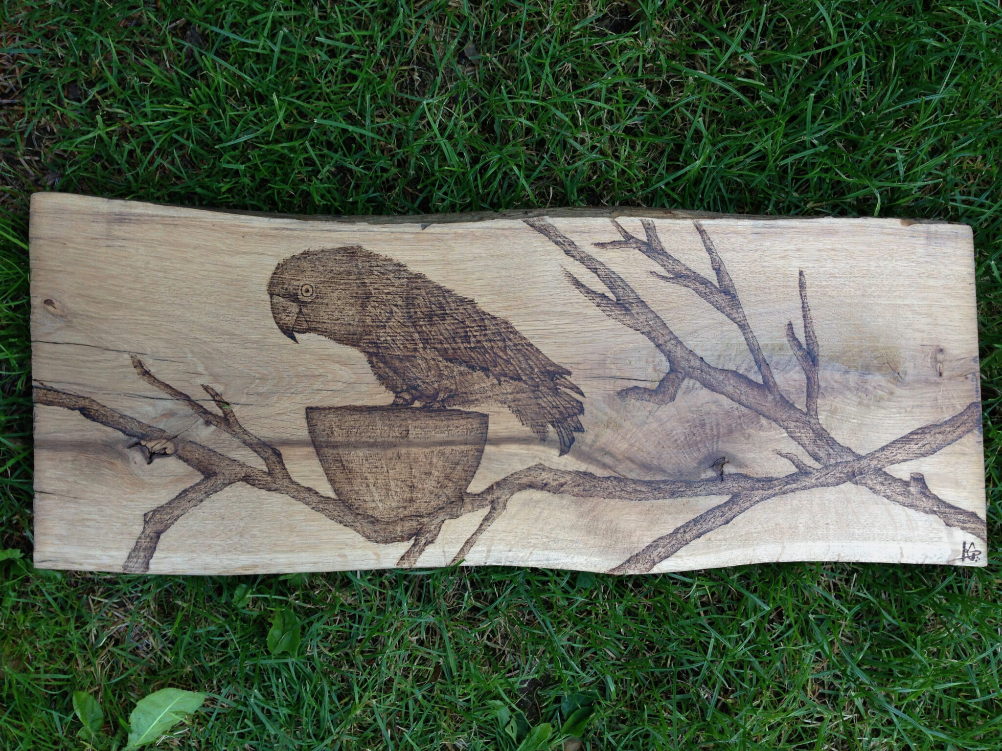 Pyrografie je originální a docela zdlouhavá technika, kdy se ručně s pomocí horkého předmětu (v mém případě pera se žhavým drátem) vypalují/kreslí monochromatické obrazy do dřeva.